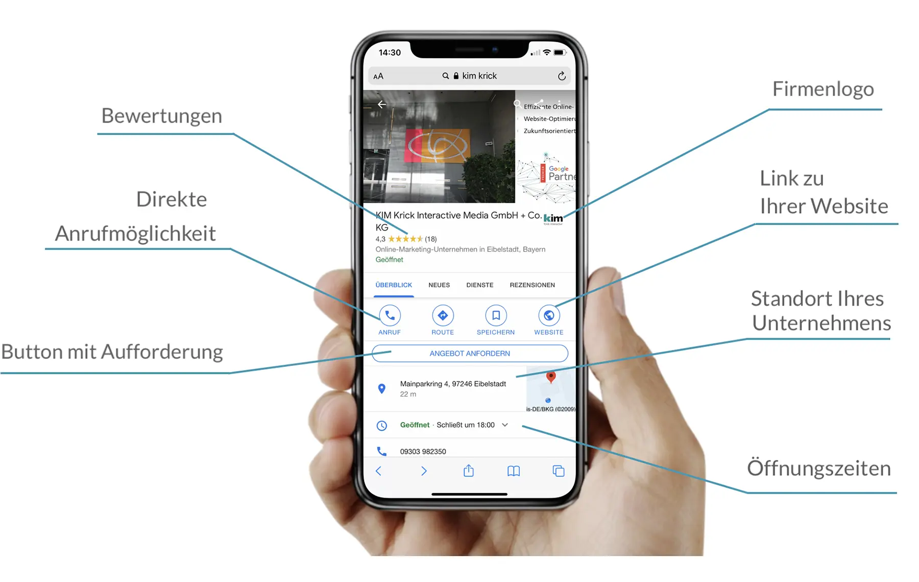 Mit einem Google Unternehmensprofil wird Ihr Unternehmen mit allen relevanten Daten u. a. bei Google Maps und in der Google Suche gefunden. Alle relevanten Informationen stehen schon ohne einen Klick zur VerfĂŒgung.